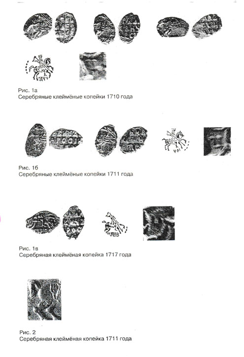 Клейменые копейки 1710 года известны с 8-ю вариантами оборотной стороны, а копейки 1711и1717 годов — с двумя вариантами каждый. Аналогичный факт клеймения русских монет известен из книги В.В.Узденикова "Монеты России" . На медных копейках Петра I, чеканенных в 1711 и 1713 годах, автор также выявил подобные буквы, поме¬щенные на задней ноге коня (рис 2). Ученым было отмечено, что "клеймо "Ц"... впервые появляется в 1711 году" и "это клеймо выбивалось пунсоном не на готовых монетах, и даже не на штемпеле, а на маточнике". Автор также отмечает, что копейки не имели обозначения монетного двора, но были изготовлены на Кадашевском дворе. И в заключение сообщает, что "значение клейма "Ц" до настоящего времени не расшифровано" .