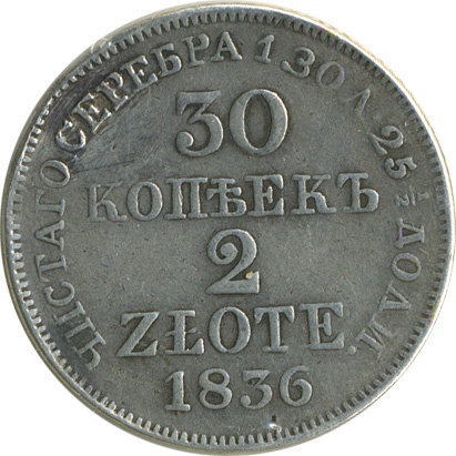 30 копеек/2 злотых, 1836, МW