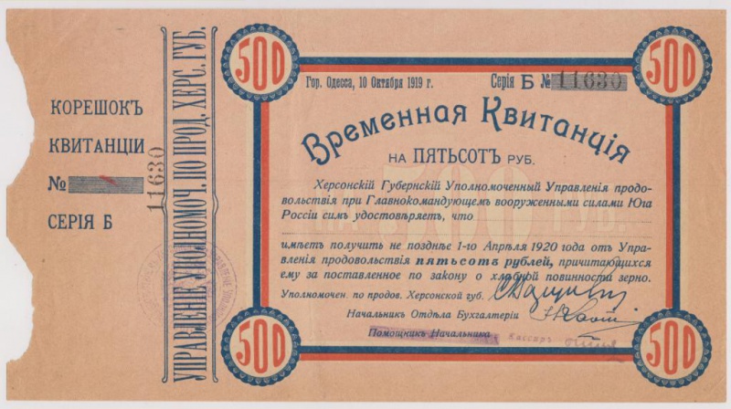 Херсон, временная квитанция, на 500 рублей, 1919 год, пресс